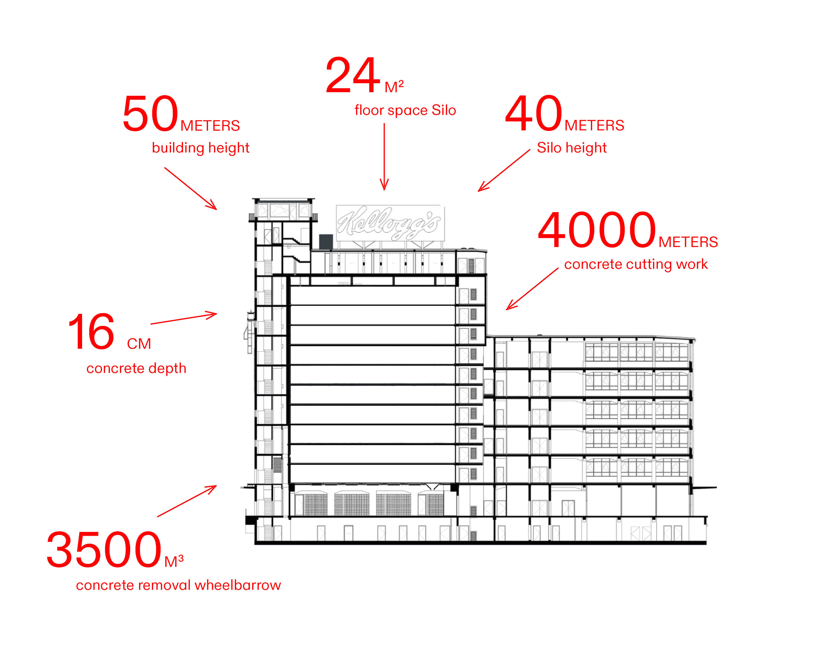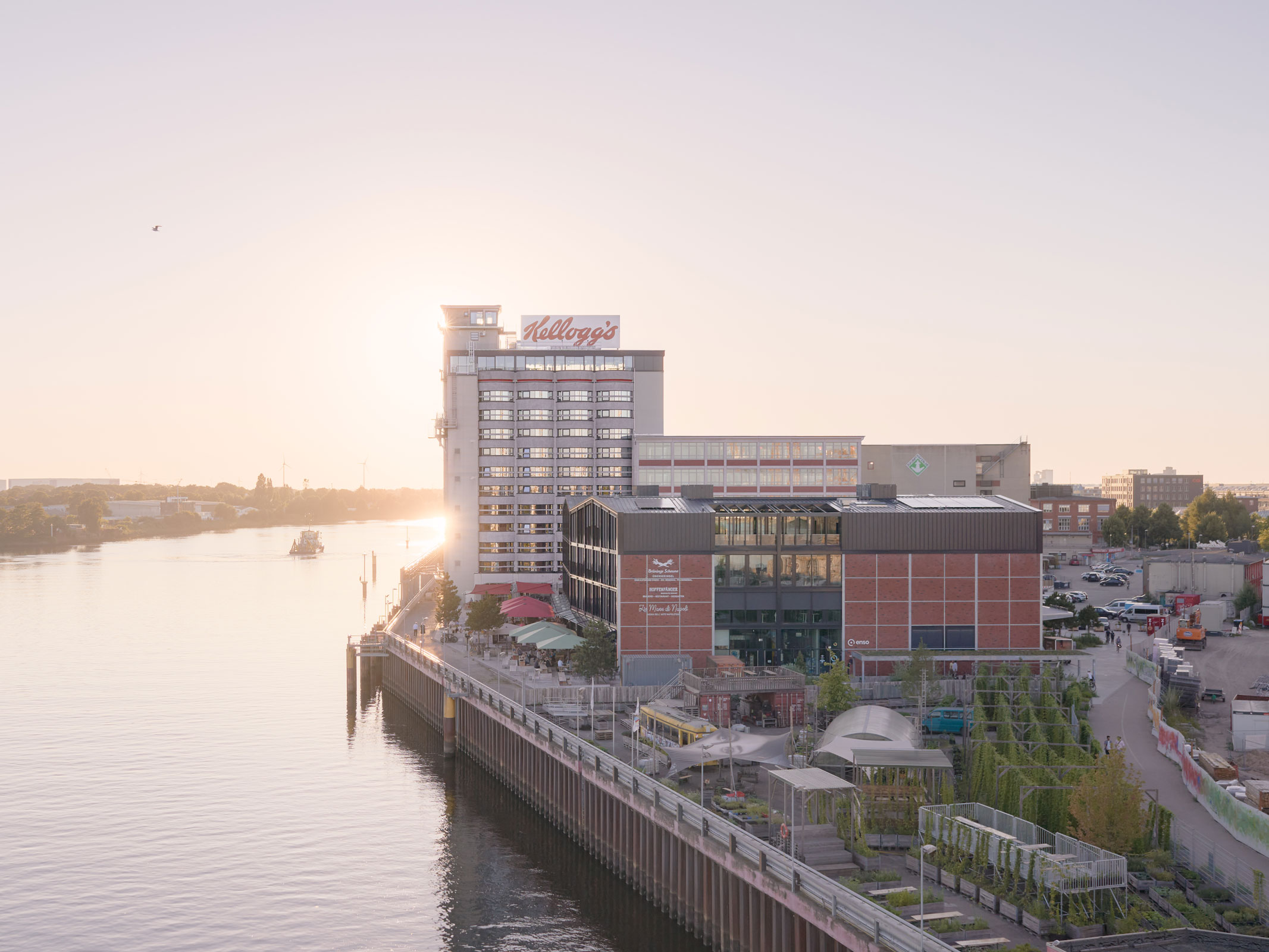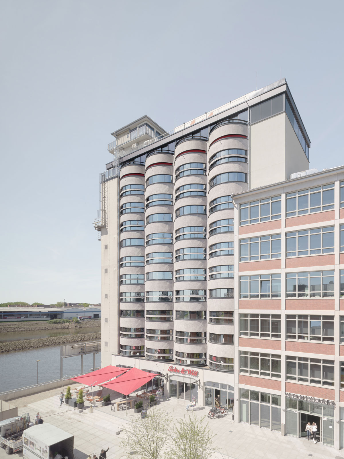 Aus einer brachliegenden Industrieruine entstand ein Landmark für das Stadtentwicklungsprojekt "Überseestadt" in Bremen. Die 40 Meter hohen alten Silos von Kellogg's sind nun ein Hotel: 14 Stockwerke für Gäste statt Lager für bis zu 5.000 Tonnen Getreide. In die 16 cm dicken Betonringe wurden Fensteröffnungen gefräst. Die trichterförmigen Auslässe der Silos blieben in der Hotelloby erhalten und wurden in das Erscheinungsbild integriert. Die 117 Hotelzimmer sind entsprechend der Schalungen halbkreisförmig oder kreisrund. Im Anbau daneben, wo früher Vitamine lagerten, gibt es nun Büroräume, Konferenzsäle und eine Eventfläche am Dachgeschoß.