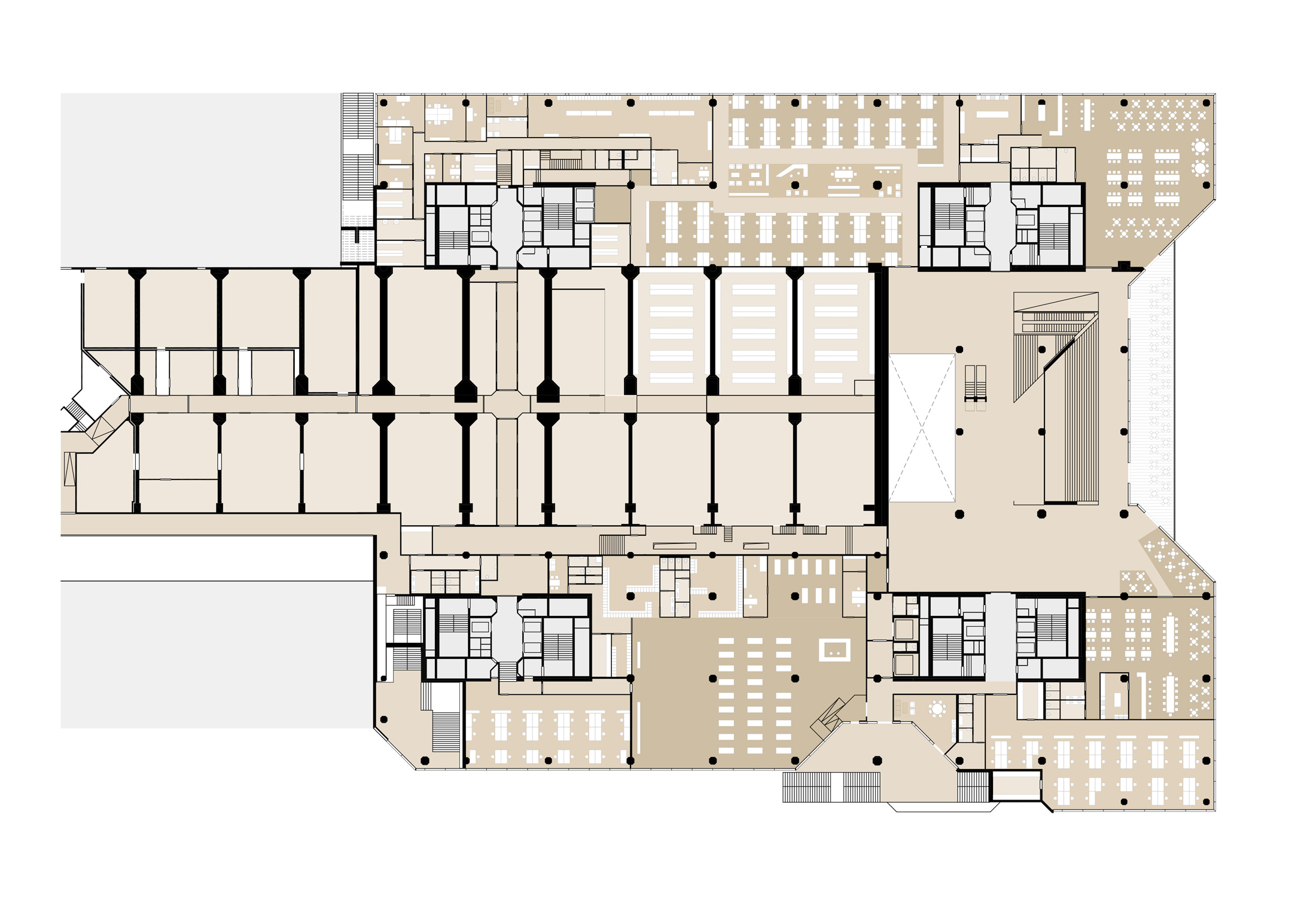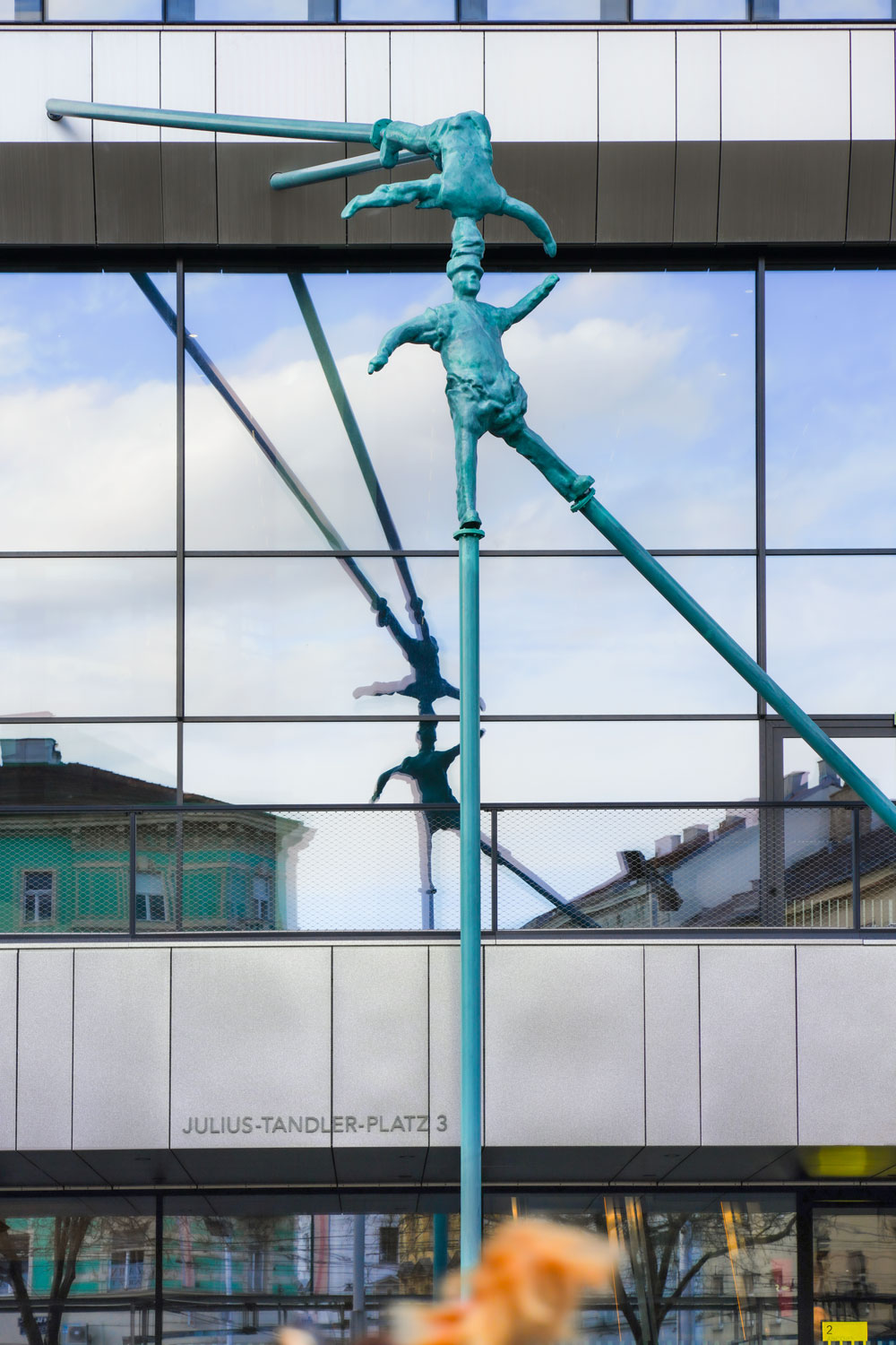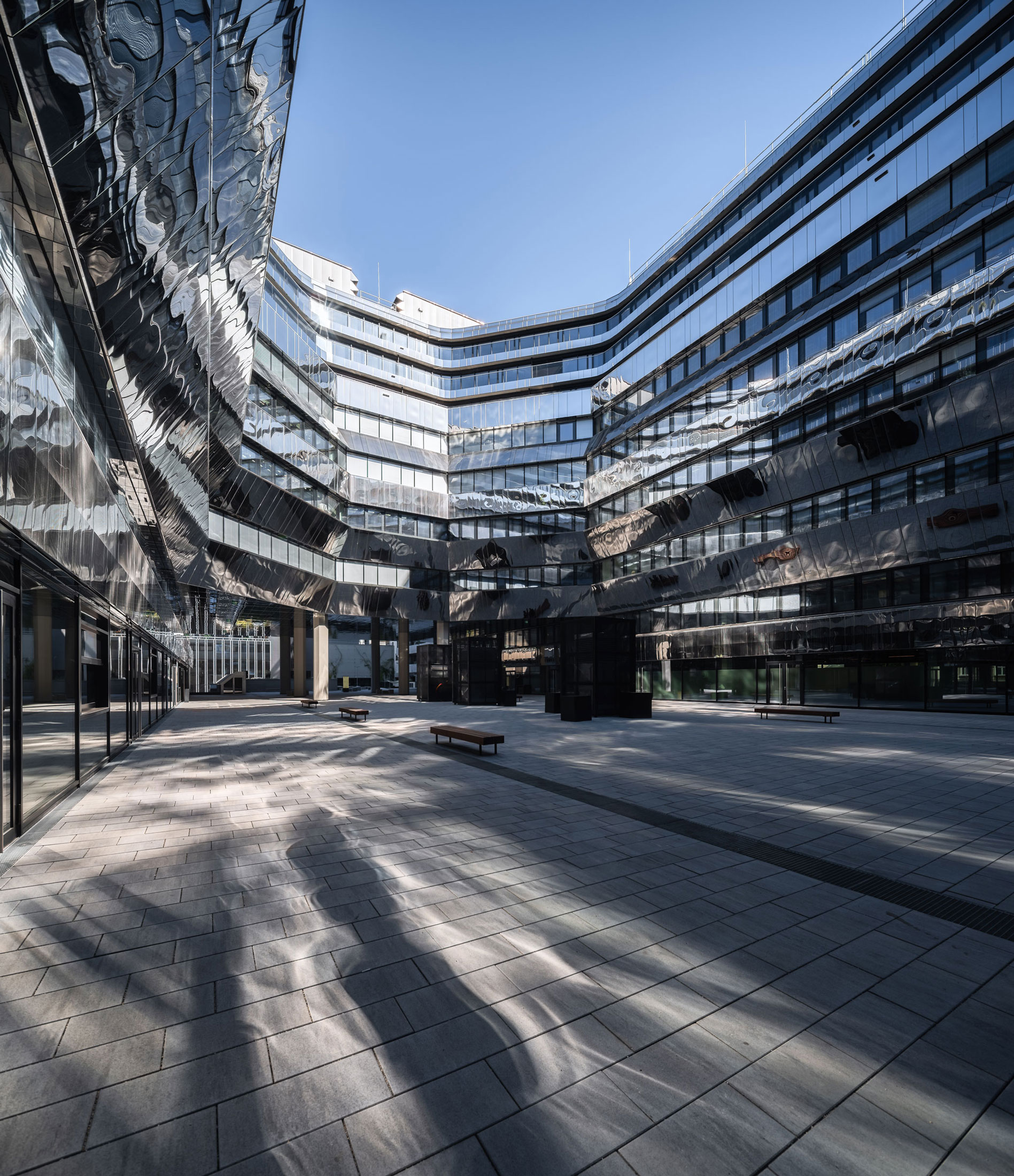 Characteristics of the existing building in its function as the headquarters of Bank Austria were the mirrored façade and a striking, expansive but almost unused staircase. The mirrored façade emphasised the hermetic nature of the building, while the monumental gesture of the external staircase dominated the area of Julius-Tandler-Platz. The remodelling allowed these outdated stylistic elements to be removed.