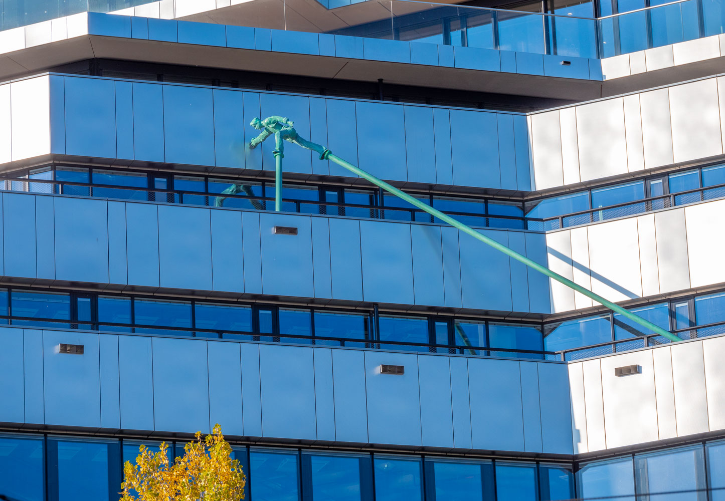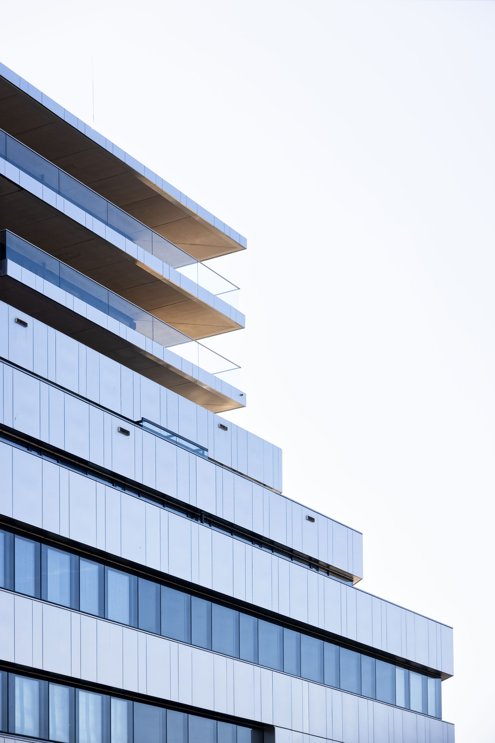 The façade of the building was freed from its mirroring. The new stainless steel cladding of the façade has a glare-free and silky matt appearance thanks to its fine embossing, while the terraces create additional open spaces for restaurants and offices and a counter-design to the building‘s previous seclusion.