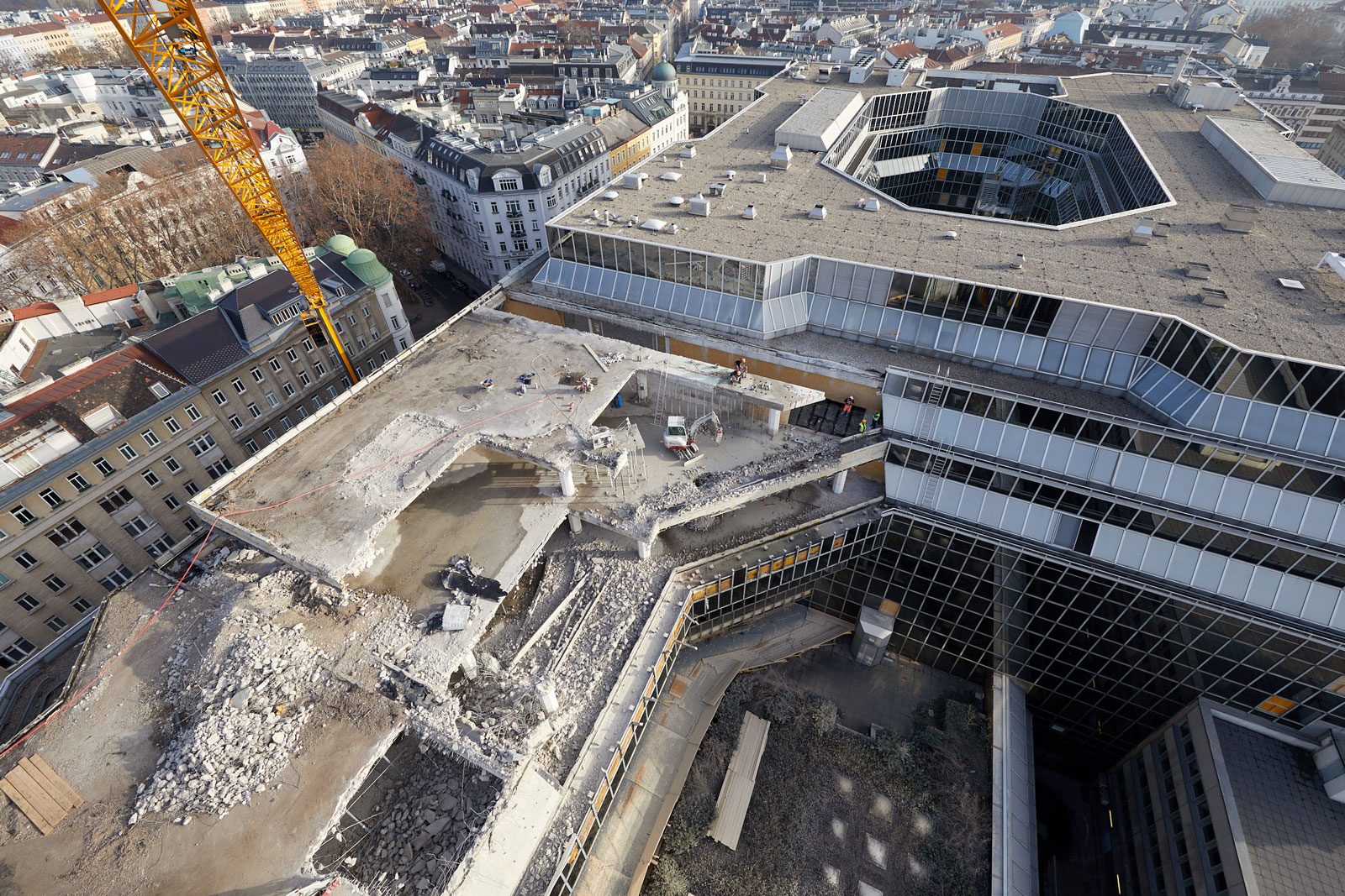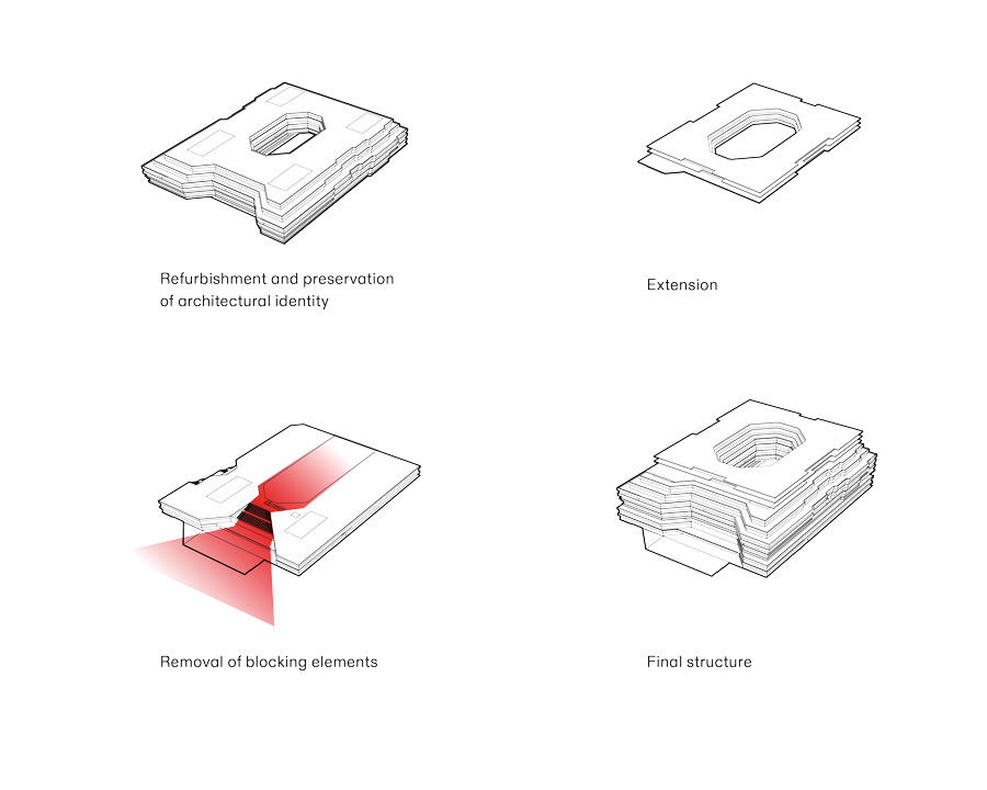The new design was preceded by an extensive reading and understanding of the existing building from the 1970s. Using historical plans and documents, DMAA and JWA analysed and internalised the initial ideas of the original architect Karl Schwanzer in order to make a fundamental decision between demolition and conversion. With the help of BIM (Building Information Modelling), a digital twin of the existing building was created, which enabled comprehensive studies of the concrete cubature and the consequences of possible adaptations. The potential of the existing building with its economically optimised reinforced concrete structure, which was exceptional for the 1970s, was thoroughly examined