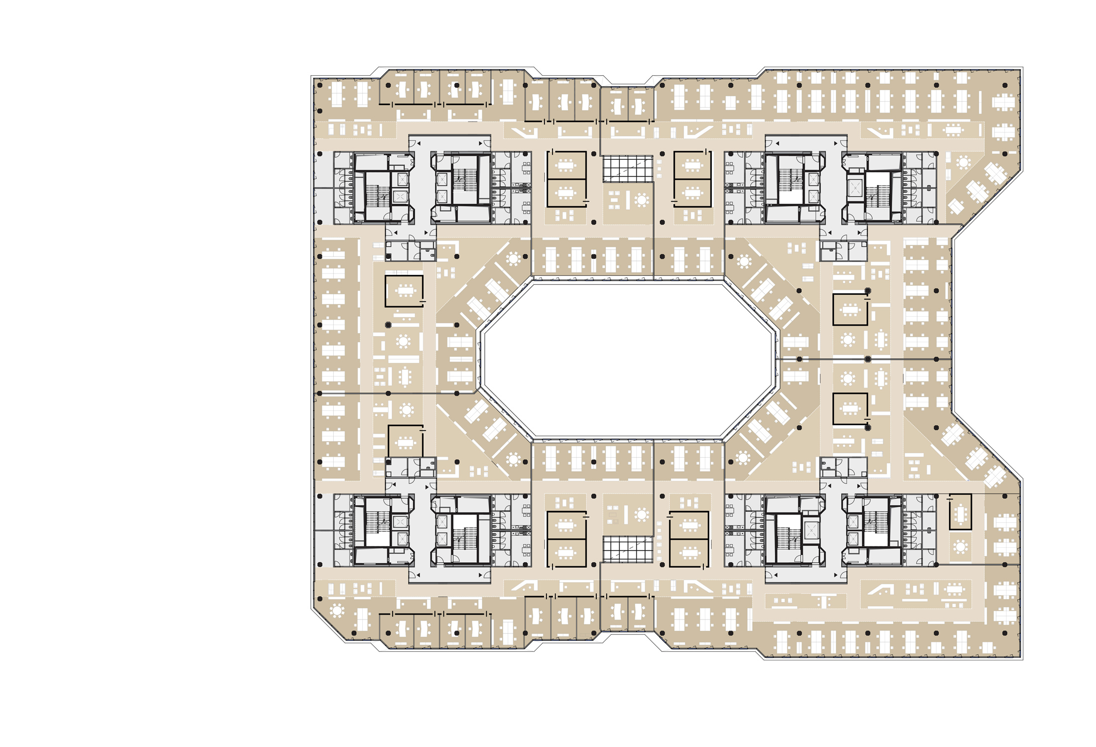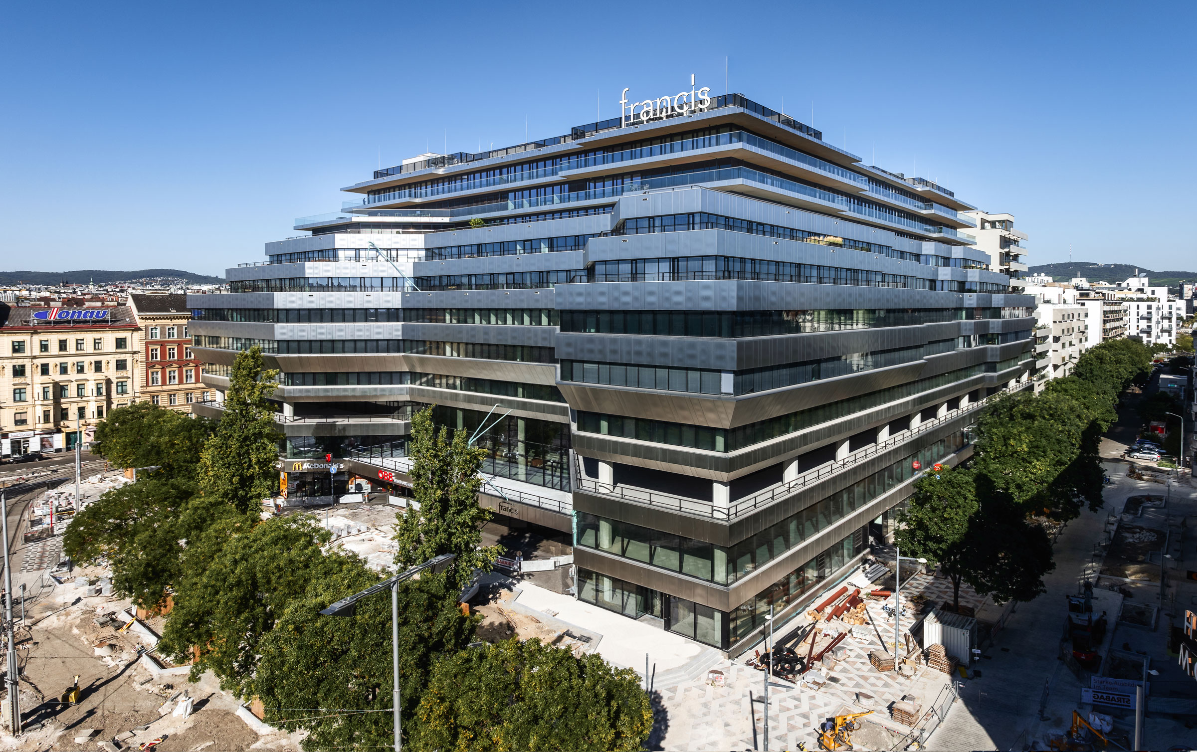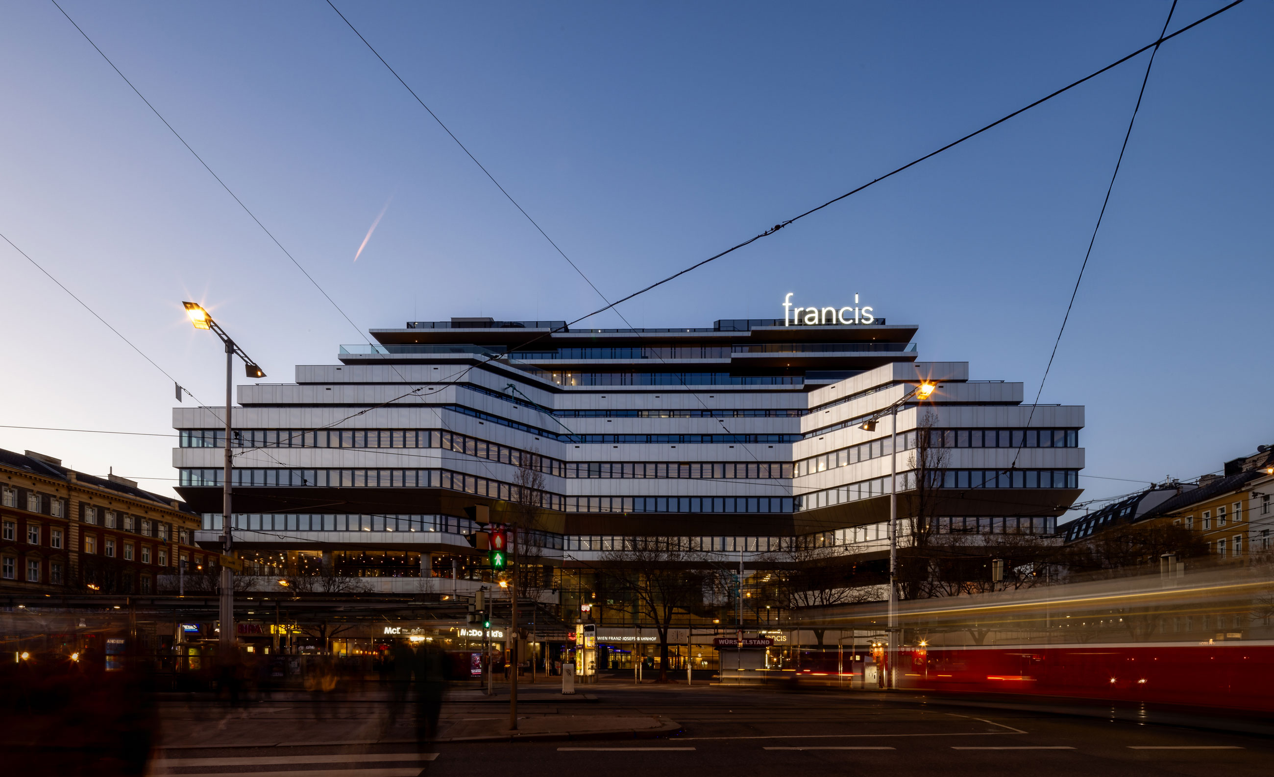 The eight office storeys with their spacious outdoor areas offer around 40,000 m² of usable space, looking out over the neighbouring palaces, Liechtenstein Park and across the city centre to St. Stephen‘s Cathedral. The optimal connection to the local and long-distance transport network, with all major means of public transport accessible within a few minutes, is forward-looking. The connection to the nearby bike routes along the Danube Canal is just as ideal. Secure bicycle parking spaces are available on the first floor of Francis. The intelligence of the building is also evident in the supply and disposal system: this is organised via the underground loading yard, thus keeping above-ground delivery traffic to a minimum.