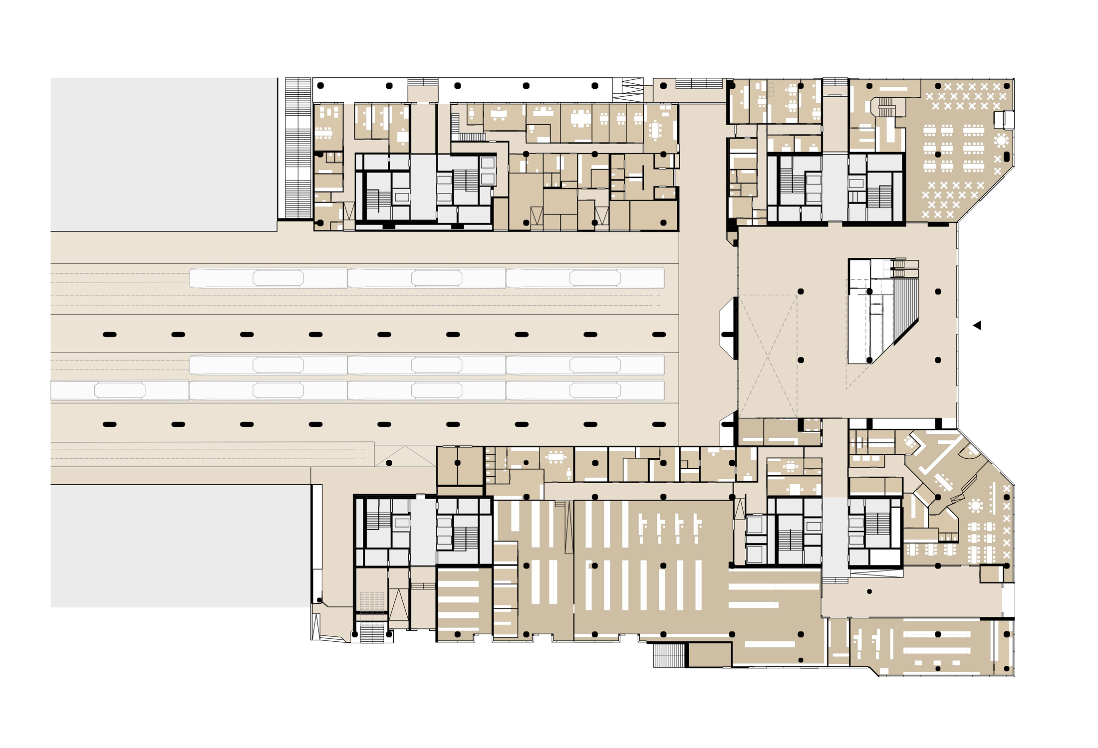 Another planning focus was on the design of a vivid base zone. The extensive opening of the base achieves the desired spatial relationship to Julius-Tandler-Platz, makes the station hall more attractive and creates an inviting connection to the central plaza level. At the northern rear of the building, a connecting structure from the 1970s, between the office complex and the garage, was removed in order to return to Karl Schwanzer‘s original idea of a cubic solitary building.
