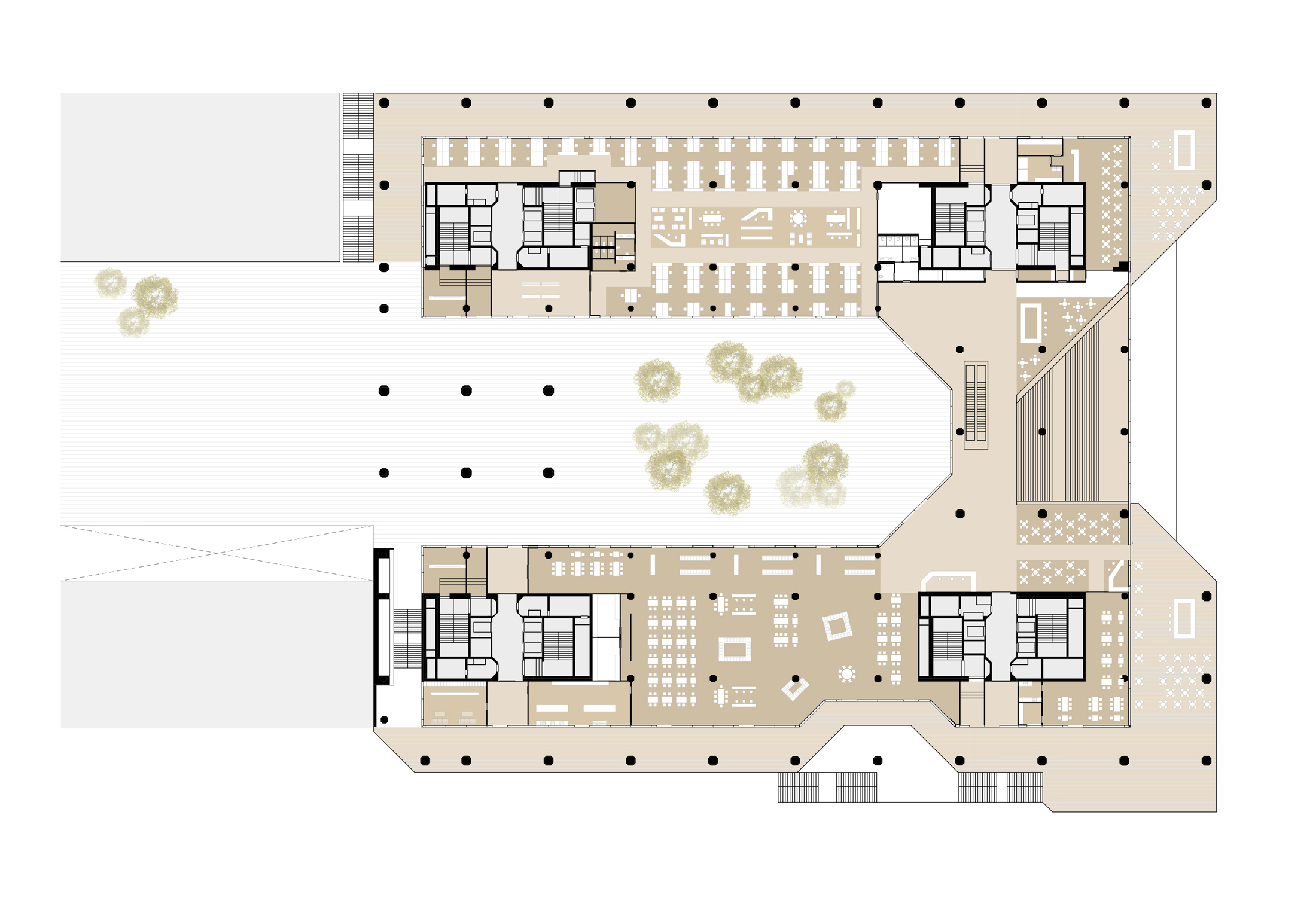 One of the main focuses of the planning process was to create a new opening to the neighbourhood: new urban places to linger, semi-public spaces, barrier-free access and restaurants with open spaces were to be created. The dimensions and substance of the office building were retained, but new open spaces were created, making Julius-Tandler-Platz much more attractive with a new look and increased accessibility.