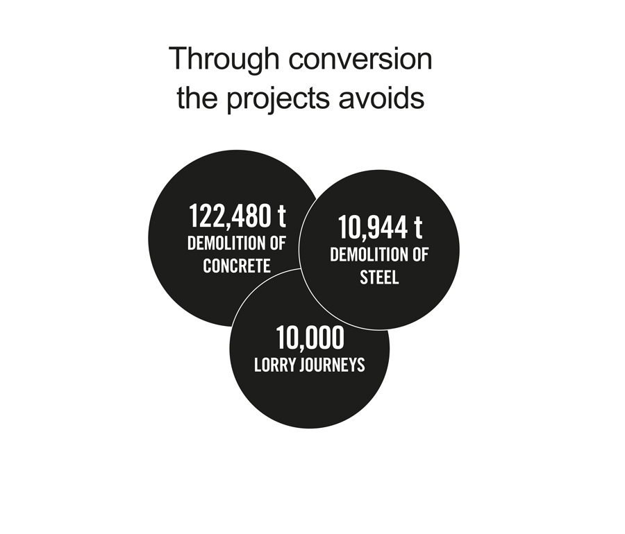 The project illustrates the potential for urban development and the environment that lies in the transformation of existing buildings. Particularly in times of land and resource scarcity, the preservation and further development of valuable existing structures is worthwhile.