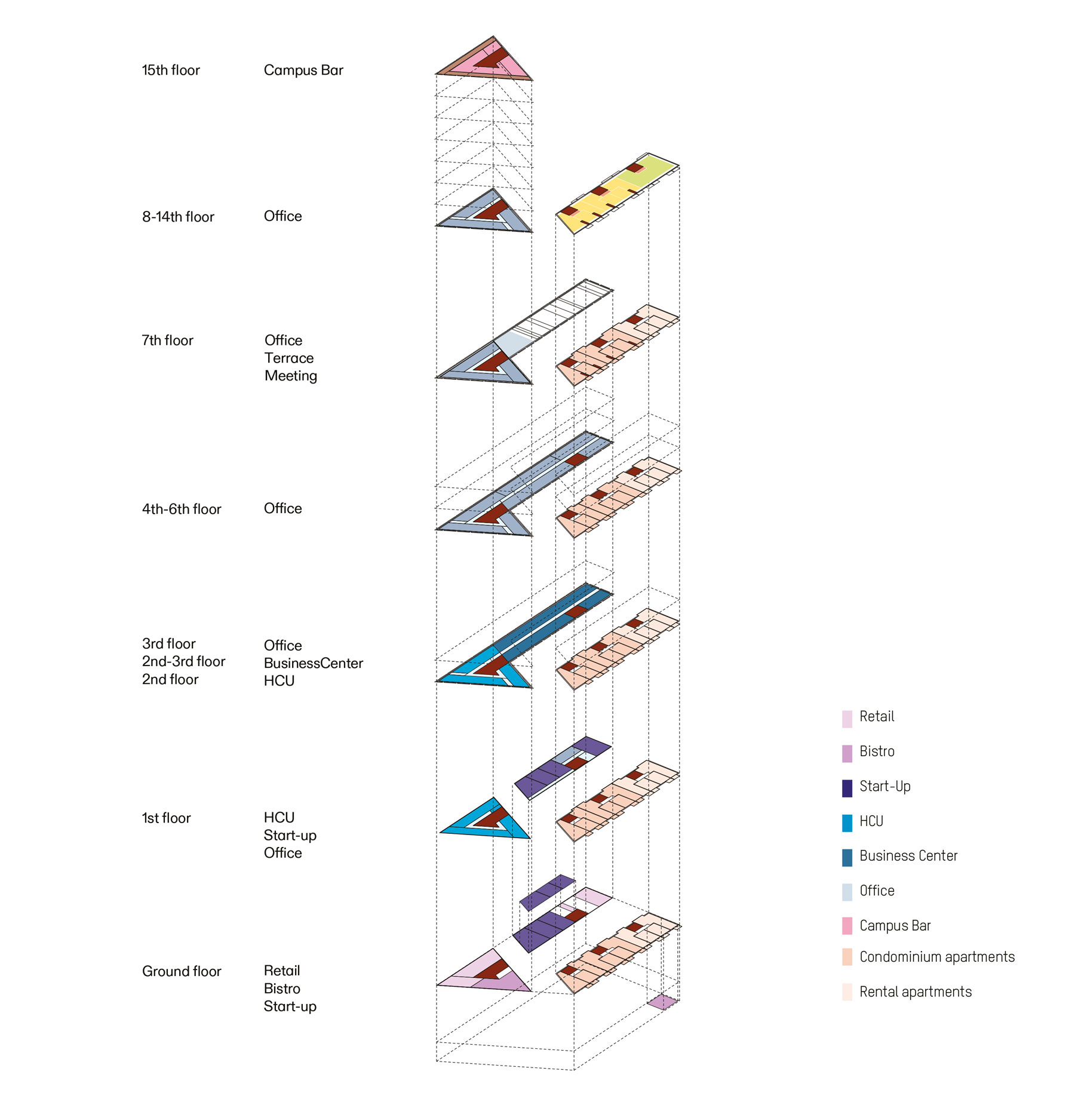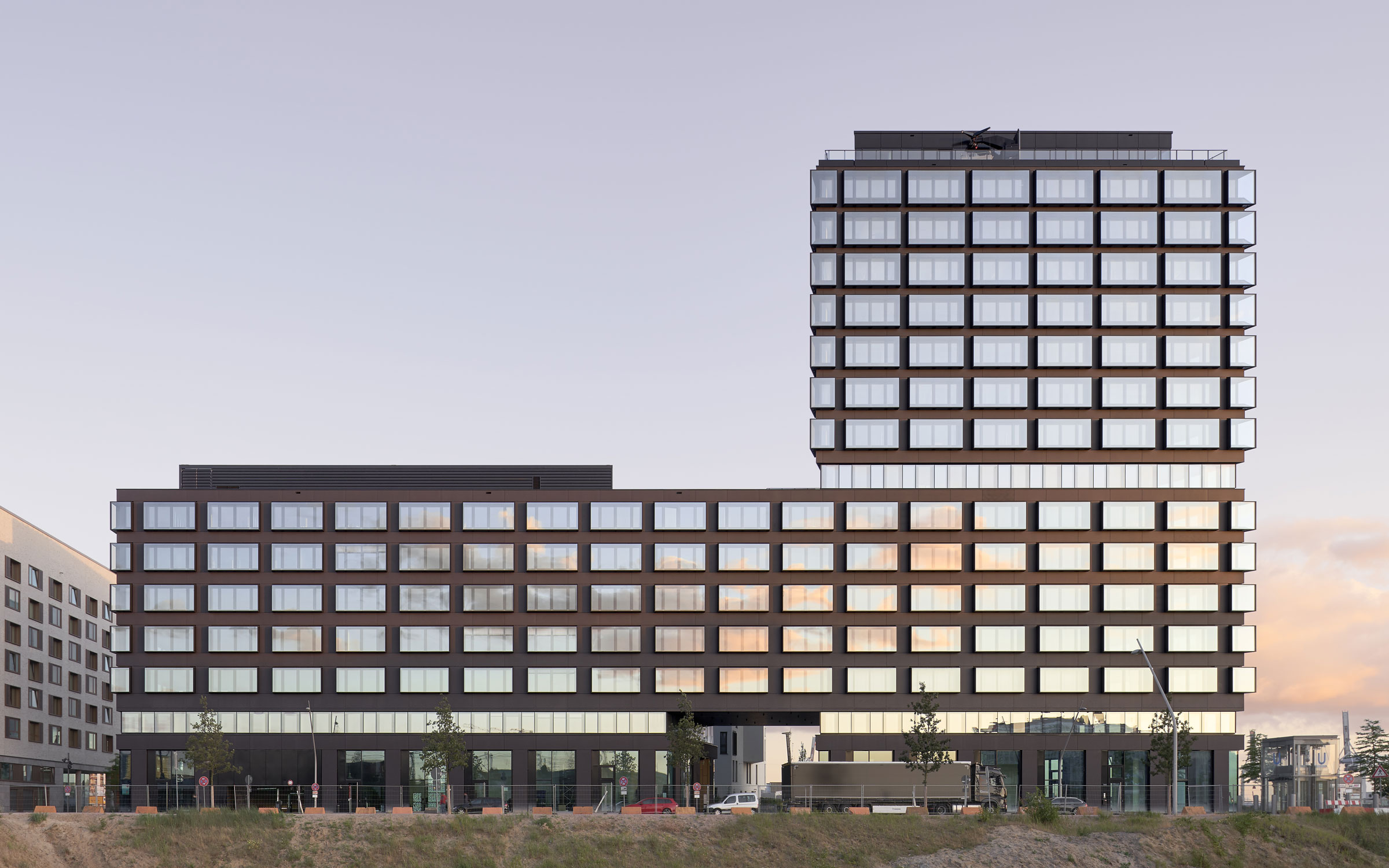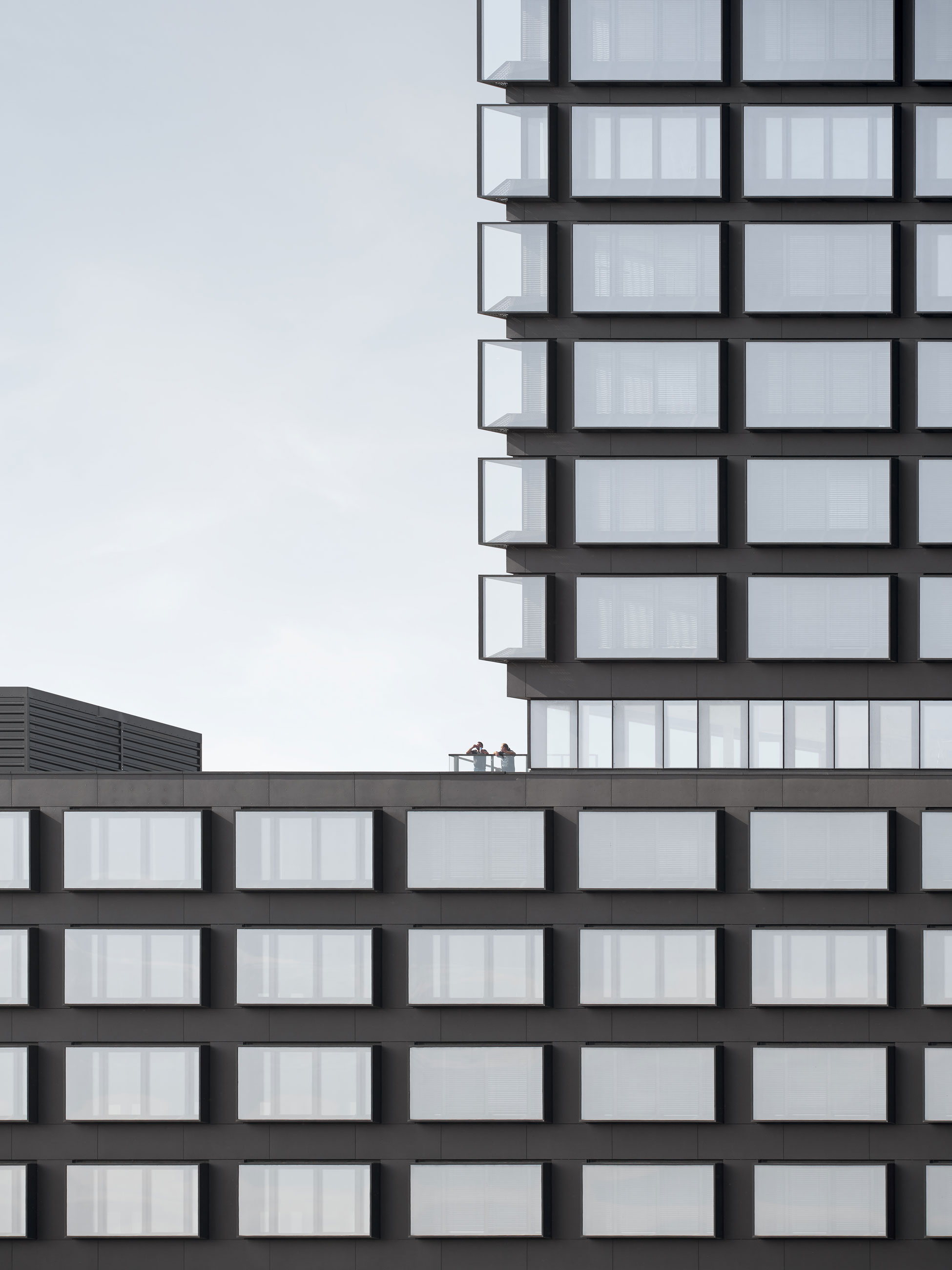 Special functions, such as the Start Up and HCU offices on the first floor, the access to the roof terrace with a connected office and meeting area on the seventh floor as well as a bar with a 360° view between the head of the building and the shed roof are located within the breaks subdividing the building. At the same time, the settling out of the head of the tower creates a sort of beacon effect radiating far beyond the borders of the property, thus guaranteeing a landmark effect from afar.