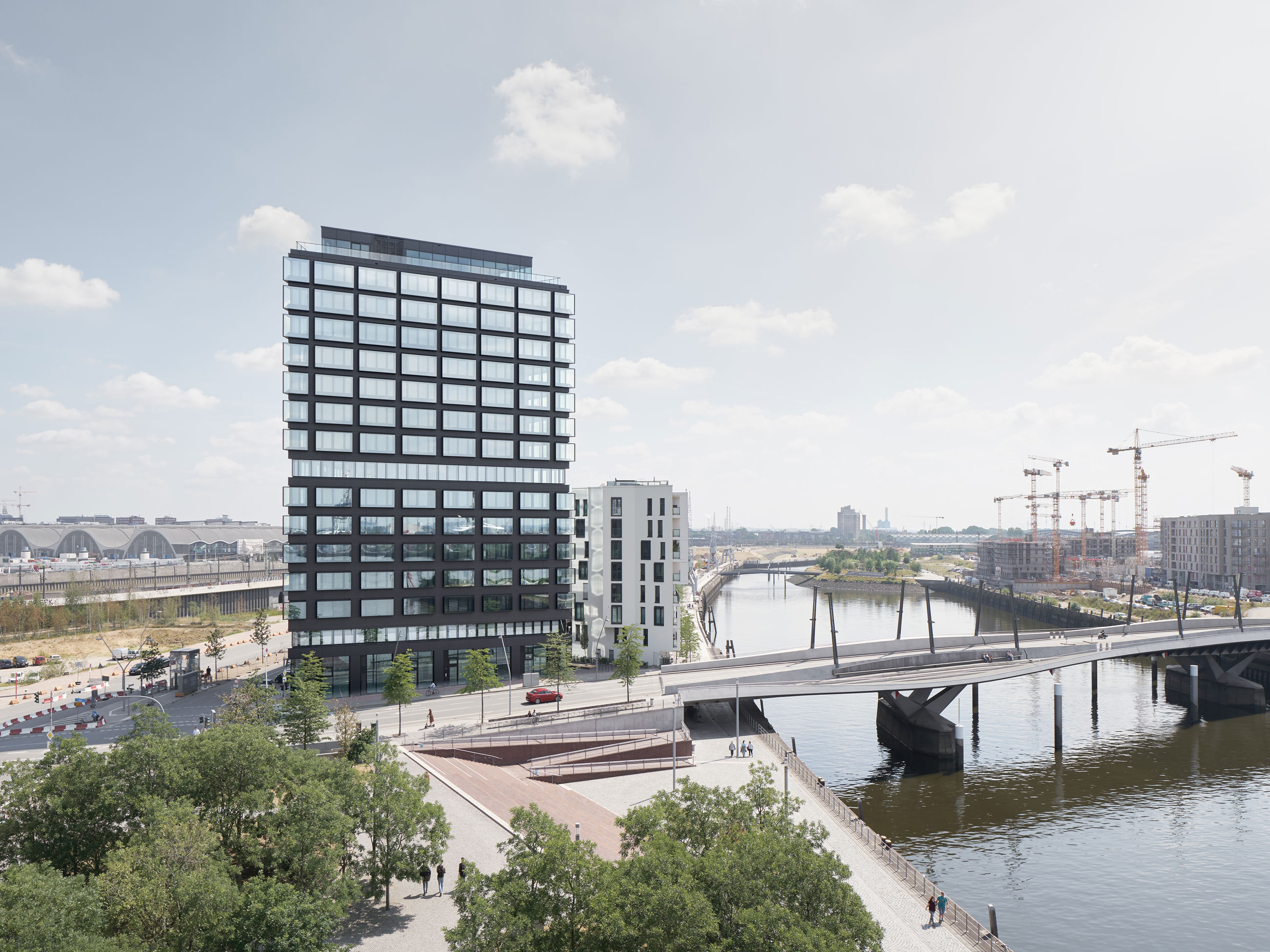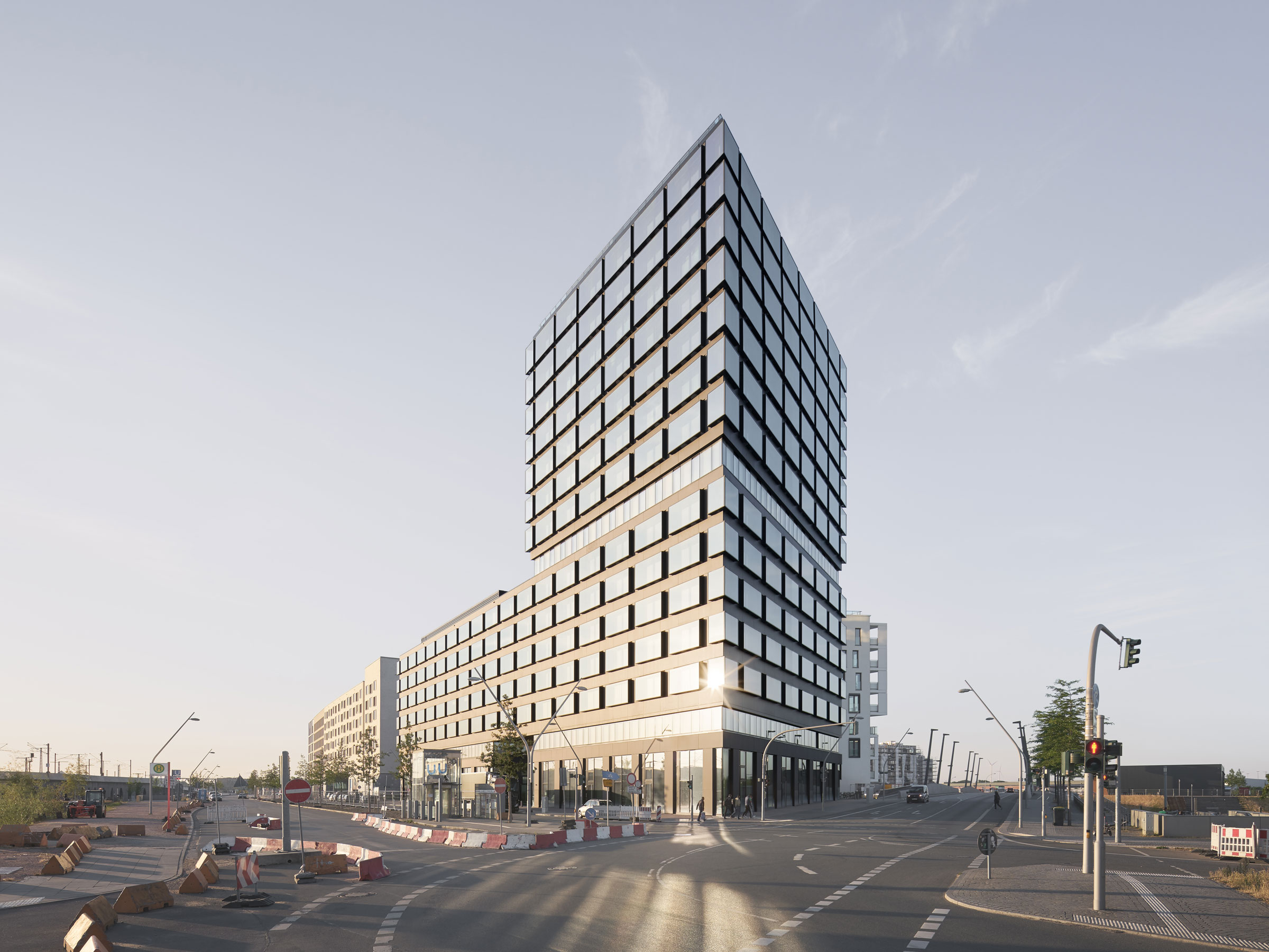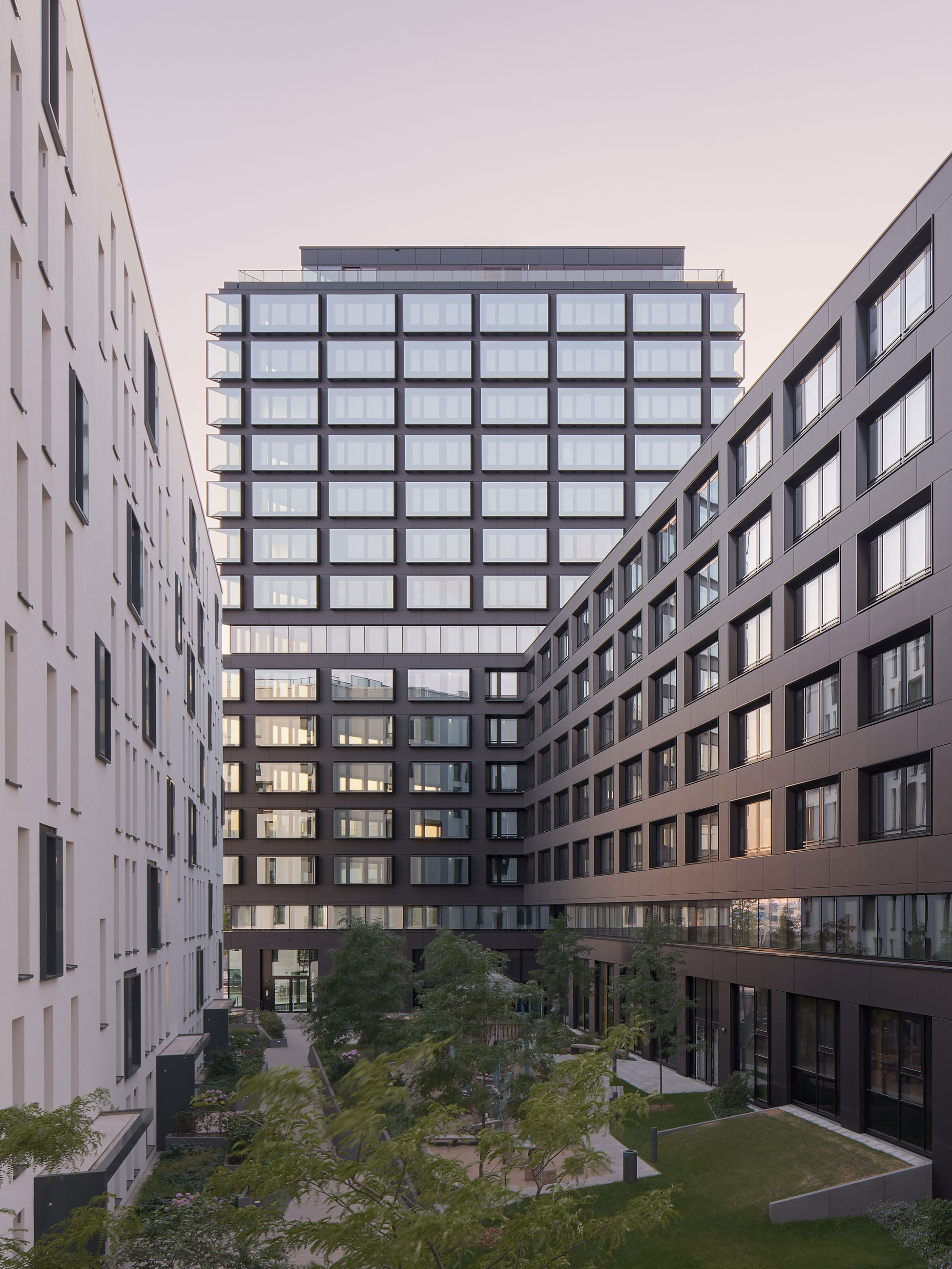 Special functions, such as the Start Up and HCU offices on the first floor, the access to the roof terrace with a connected office and meeting area on the seventh floor as well as a bar with a 360° view between the head of the building and the shed roof are located within the breaks subdividing the building. At the same time, the settling out of the head of the tower creates a sort of beacon effect radiating far beyond the borders of the property, thus guaranteeing a landmark effect from afar.