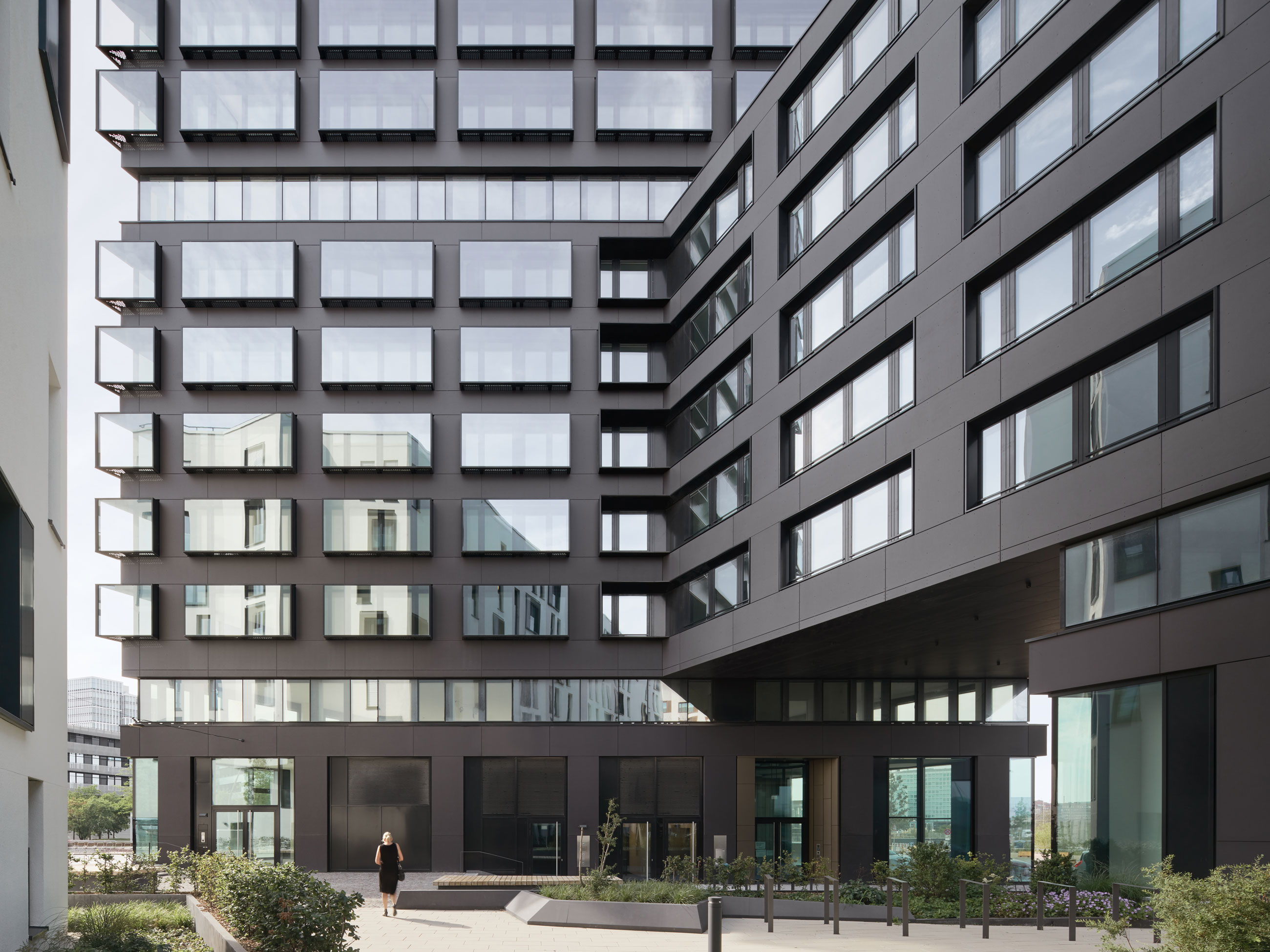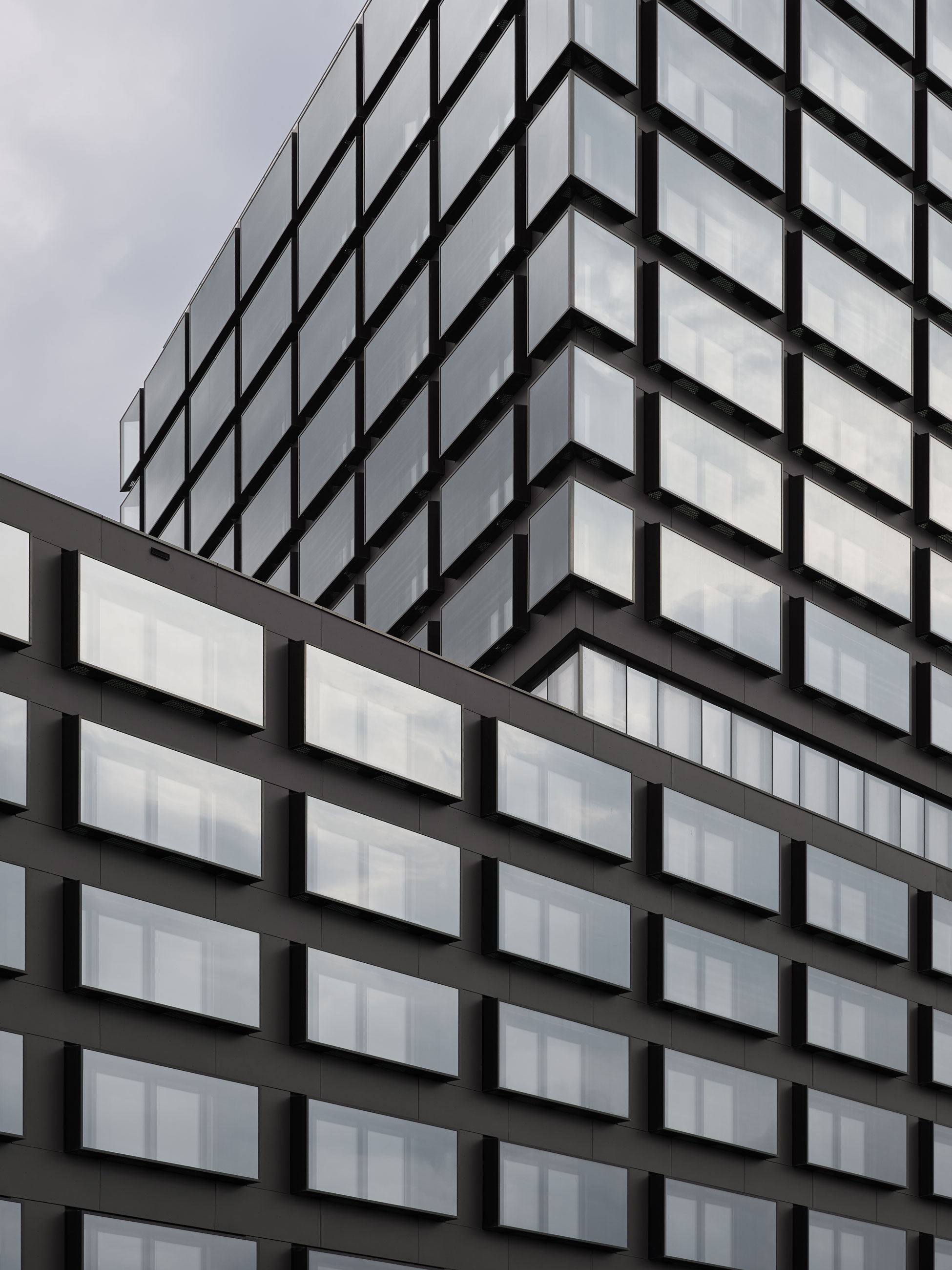 Two materials shape the outer appearance of the office building. The opaque areas are wainscoted with dark concrete slabs; the translucent zones are designed as extroverted areas, which are concluded through deflector panes. This solution accommodates the requirements of noise protection, while allowing for a sense of openness thanks to the windows.