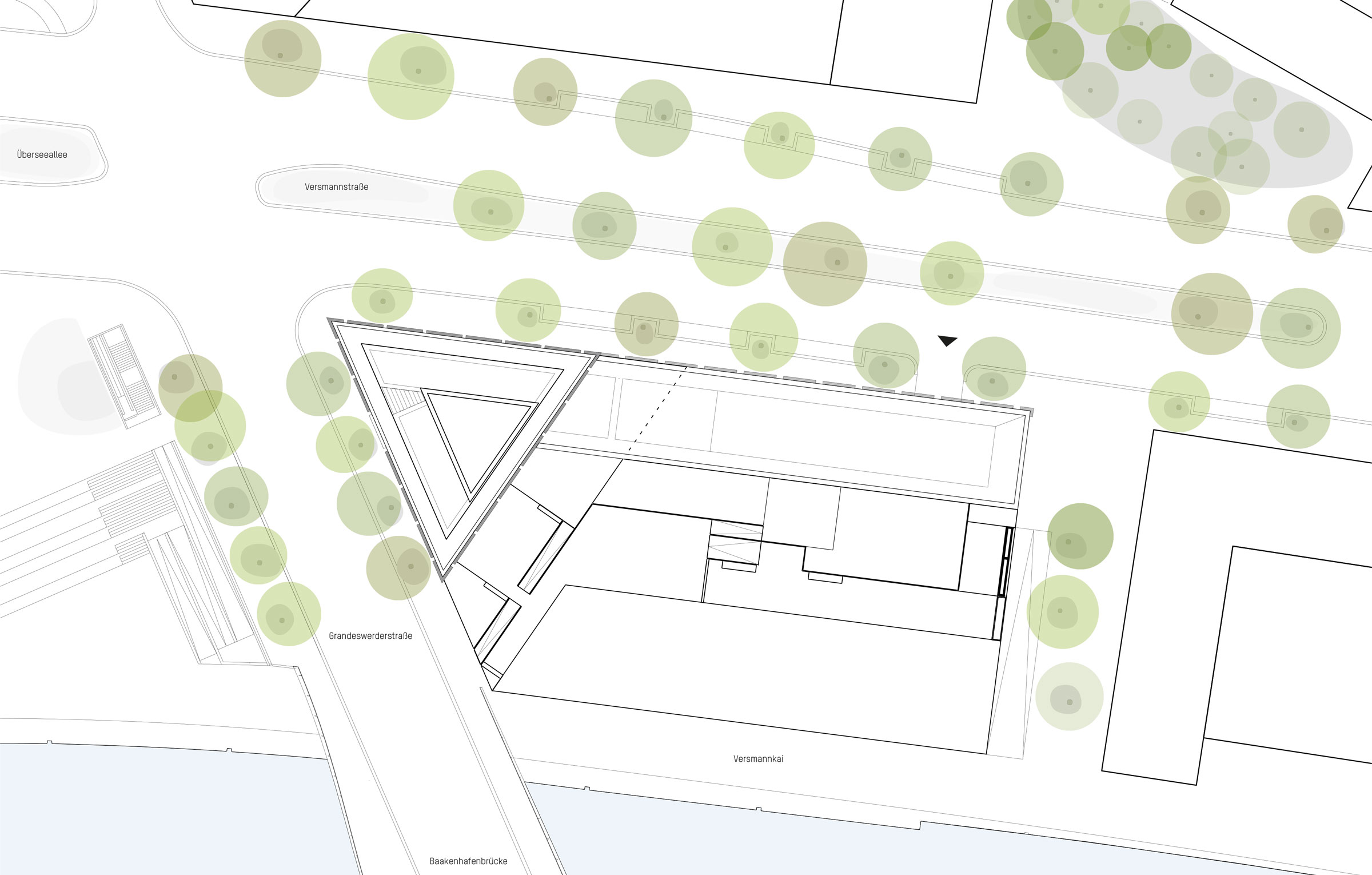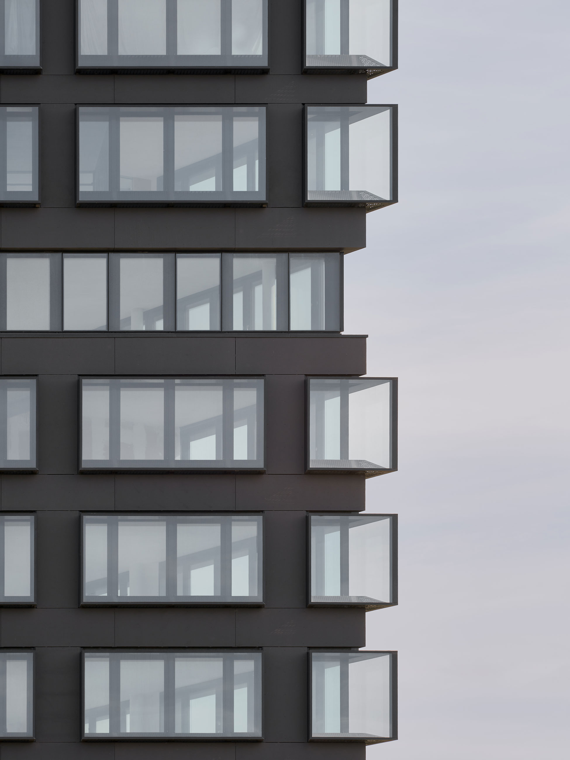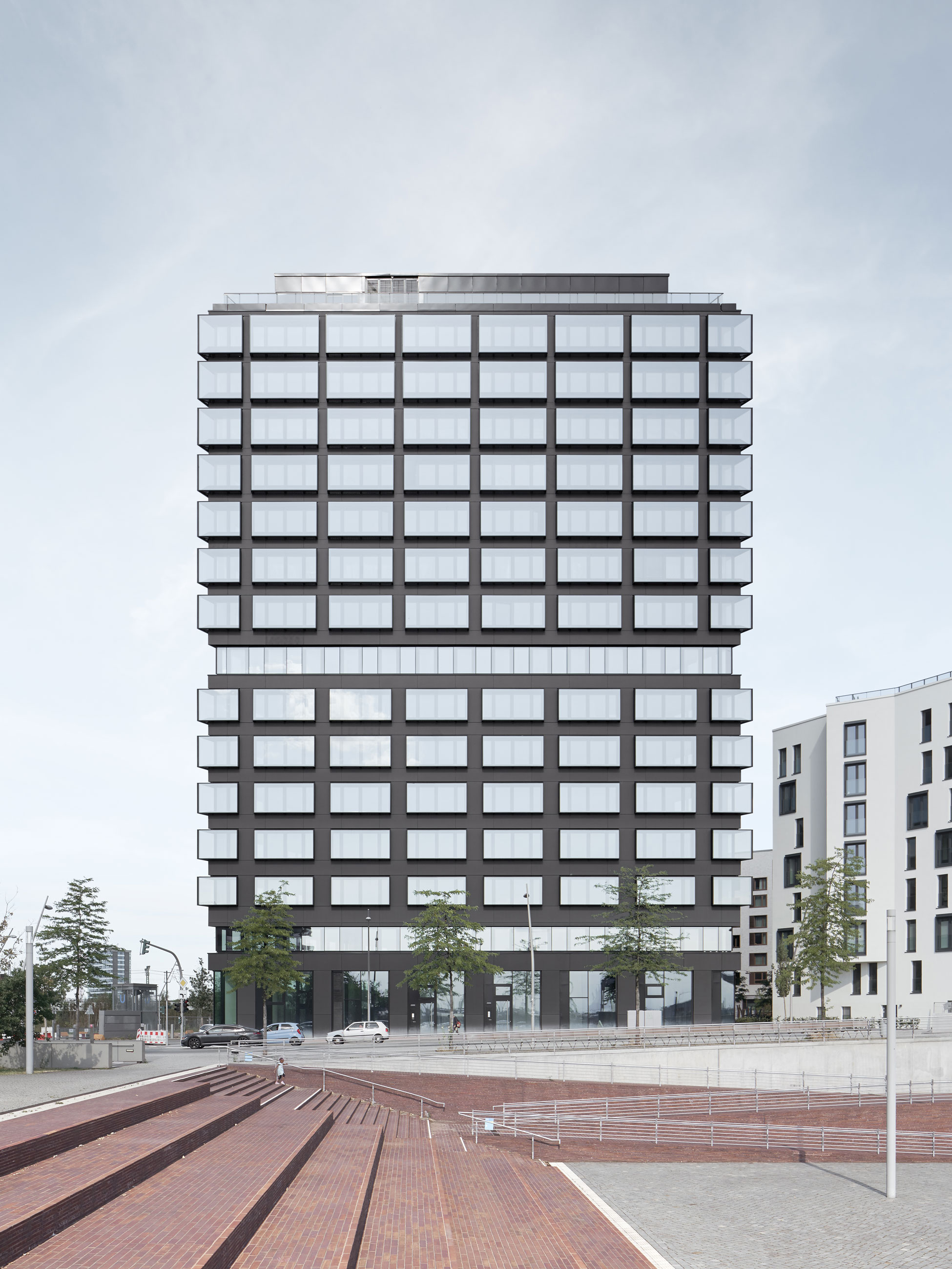 The office building is divided into three parts, which are determined by the means of contextual parameters: an architrave block, a waler and a head. This partition creates on the one hand a strong identity of the whole ensemble as an urbanistic prelude for the development of the Baakerhafen, on the other hand generates urban qualities inside the building.