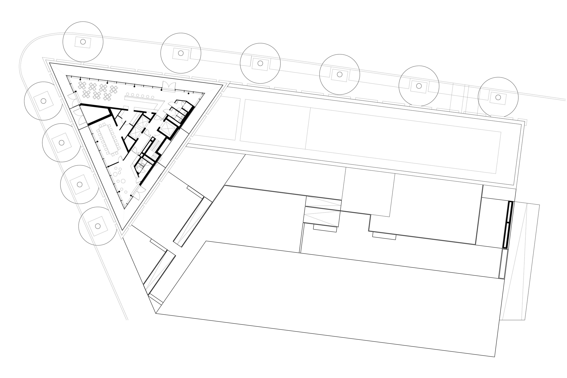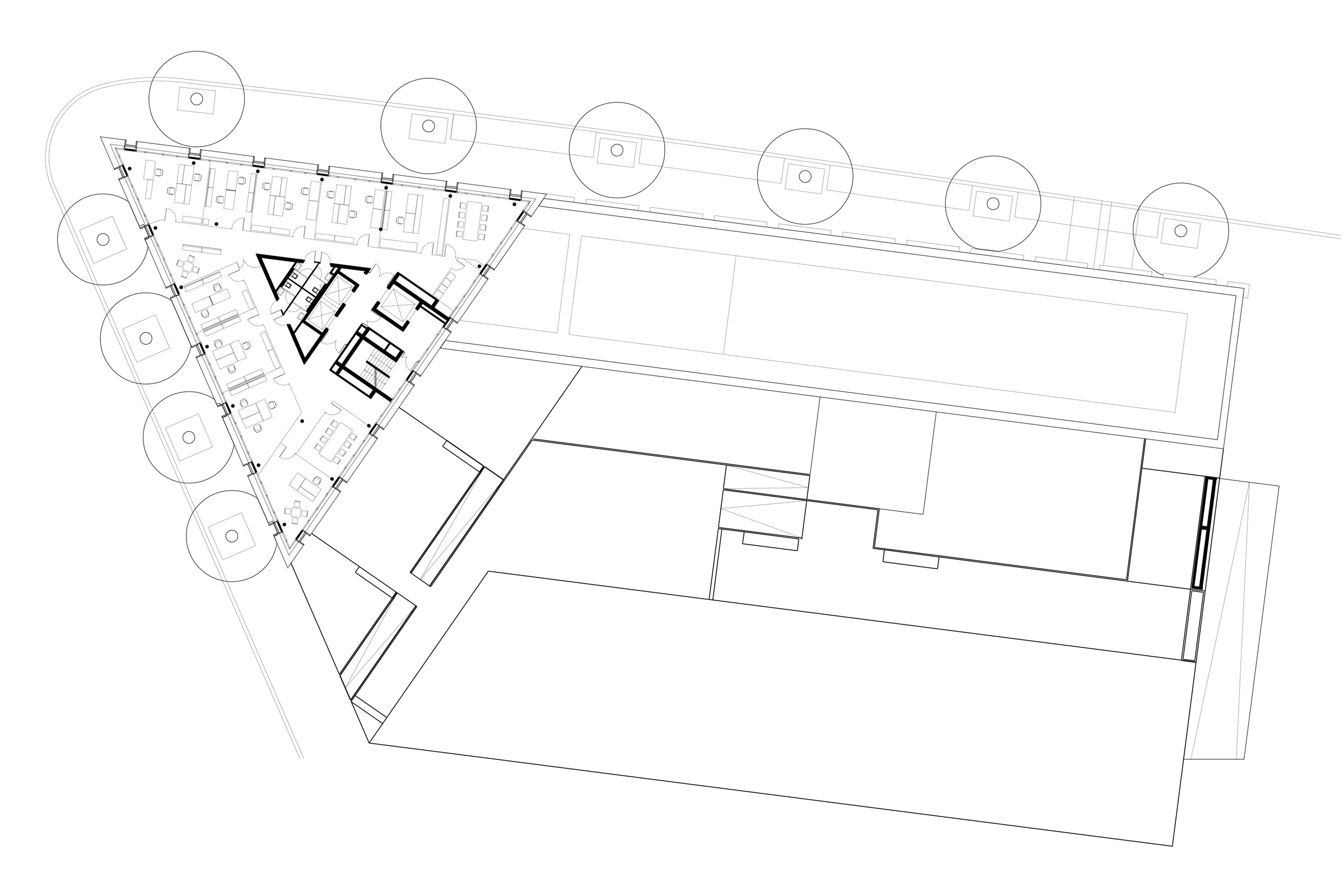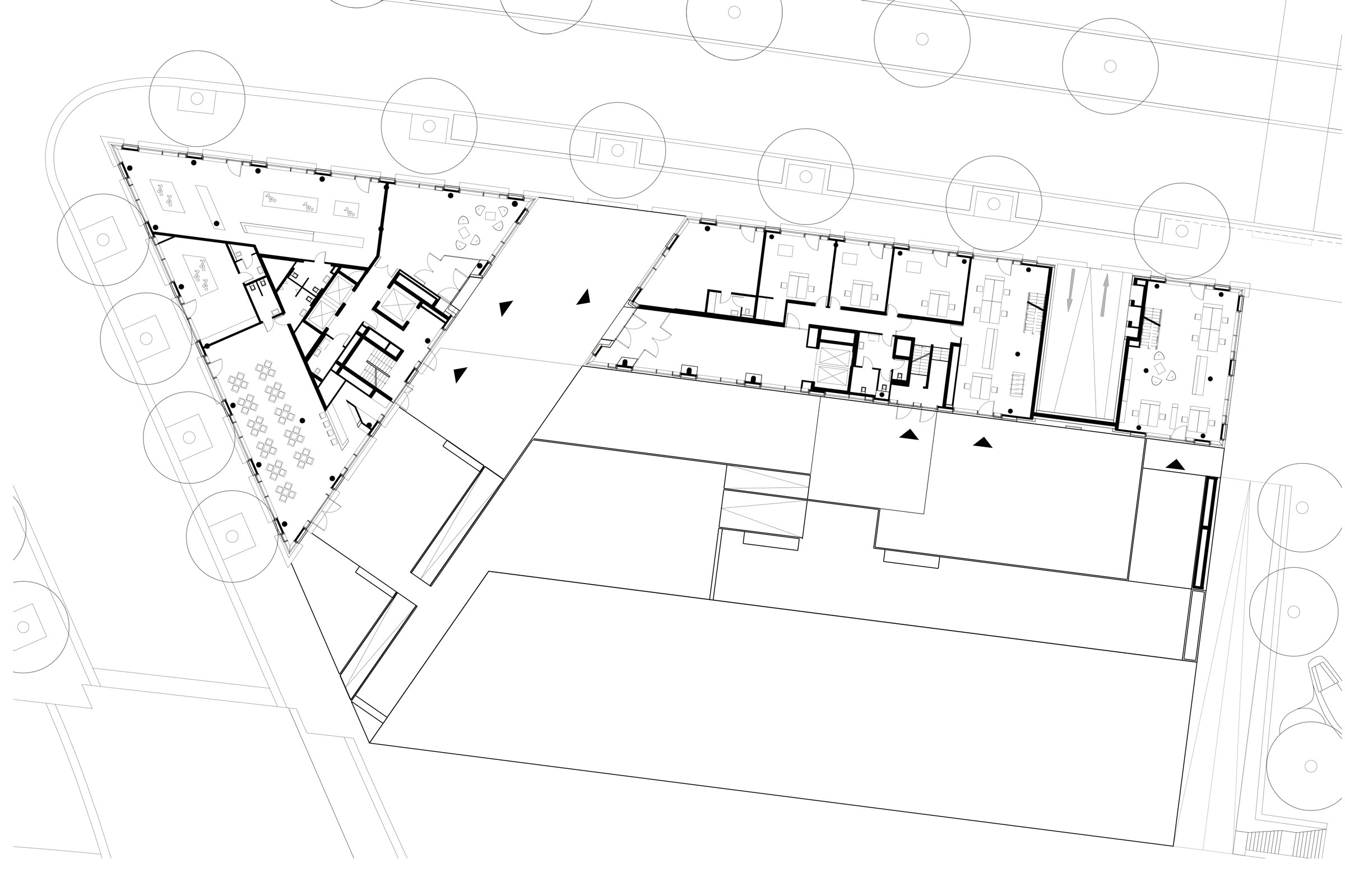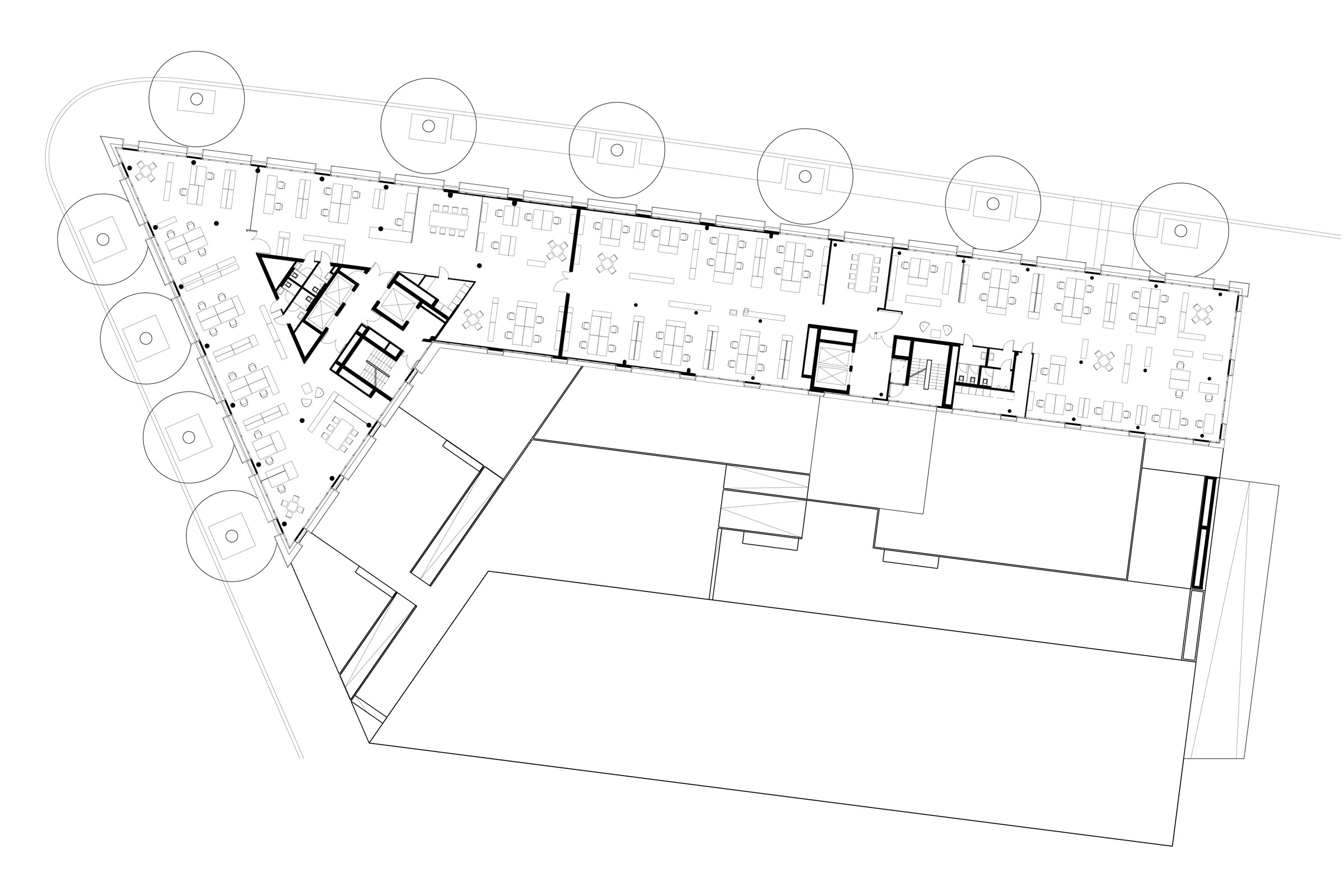 The office building is divided into three parts, which are determined by the means of contextual parameters: an architrave block, a waler and a head. This partition creates on the one hand a strong identity of the whole ensemble as an urbanistic prelude for the development of the Baakerhafen, on the other hand generates urban qualities inside the building.