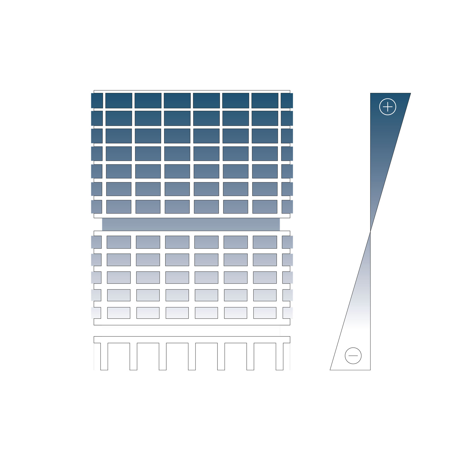 The pattern dividing the façade follows the inner structure of the building; the opaque elements in the area of the pillars and the railing are reduced at the top. In consequence, this measure creates a self-contained elegance as well as an added value and a better view for the higher levels, while at the same time offering a cost effective solution and an energetically reasonable proportion between the transparent and the opaque materials.