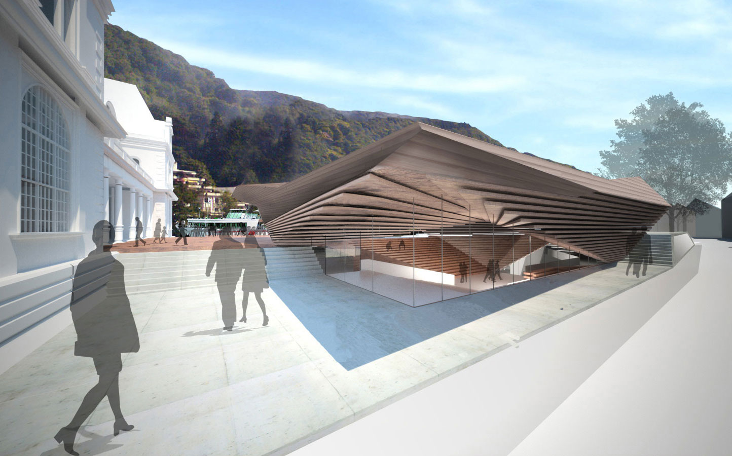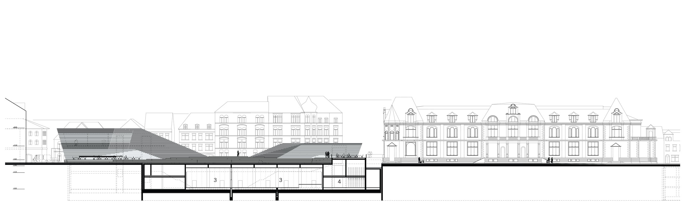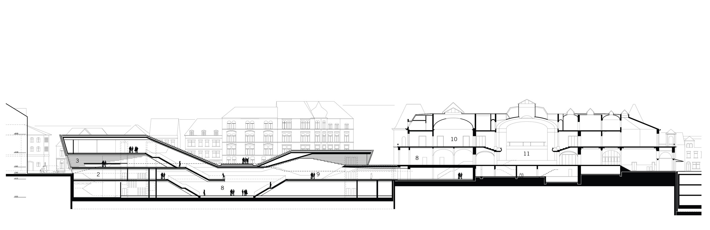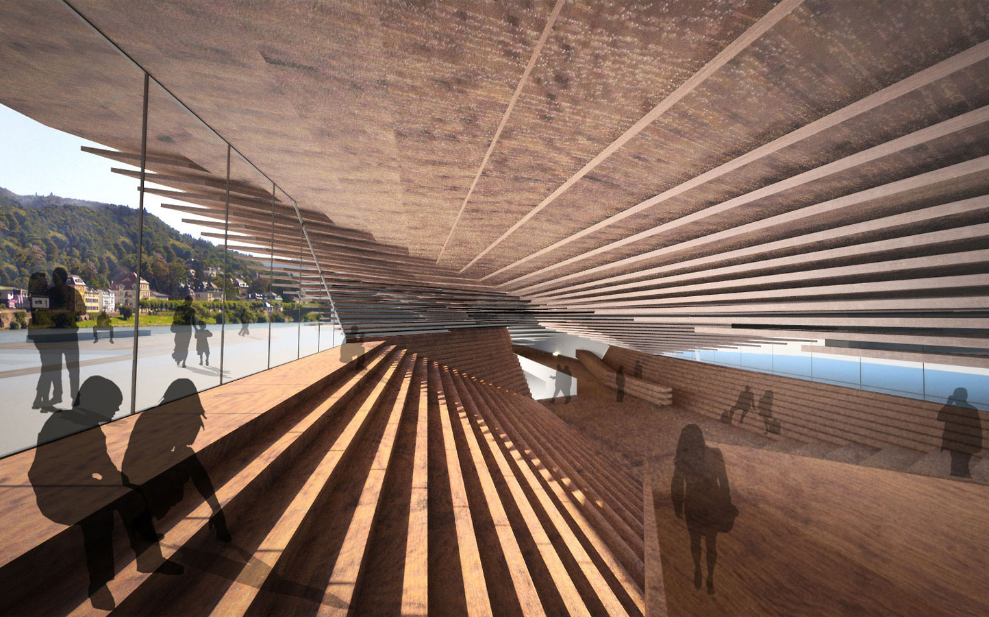 The new convention hall’s main volume was lowered in reaction to visual and functional references between the adjacent historic centre and the river Neckar, and in order to safeguard this part of the city’s existing communication- and movement-flow. Through constant layering, the entrance area rises out of the ground on the western side of the existing town hall. The entire composition of the construction layers shape a bankside landscape, generating highly pleasant and varied free spaces. A park, an open-air arena and the restaurant’s and café’s outdoor spaces merge into an extensive city terrace, which, in gentle restraint, interweaves with the surrounding texture of the historic centre. The idea of ‘integration through otherness’ was adequatly translated into a spatial configuration through associations like vaulting, terracing, recessing, hoppering, growing, flowing, angling and overhanging. Green spaces, promenade decks and landscape elements alternate in representing the building’s façade, surface and shell.