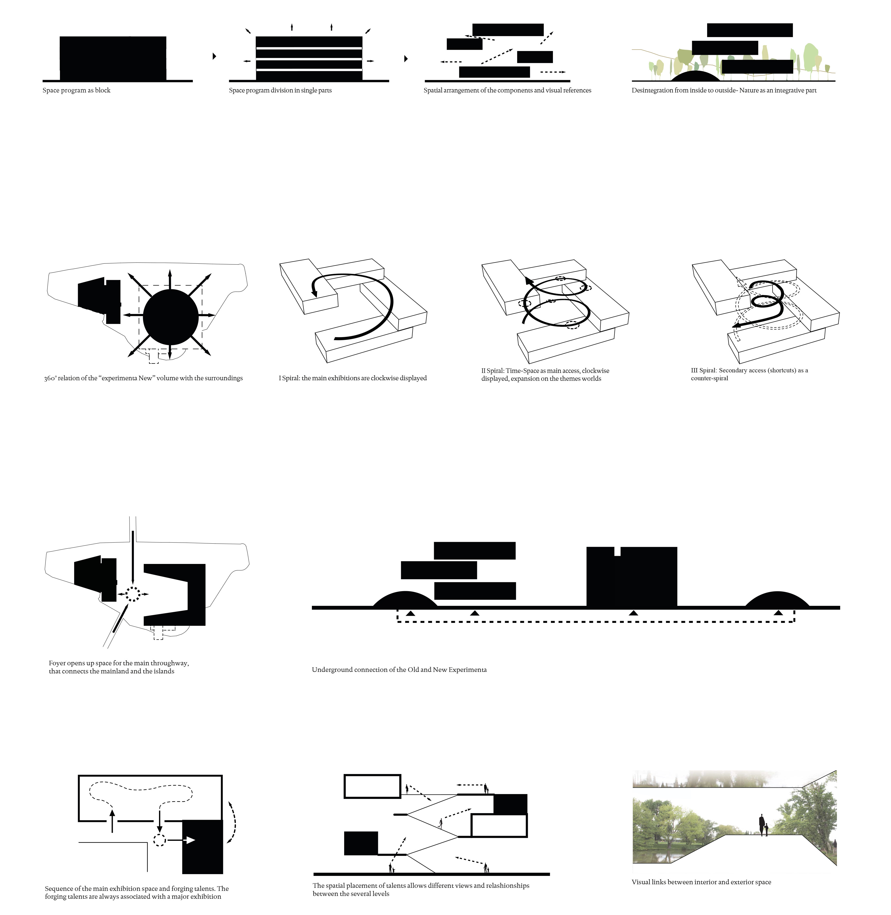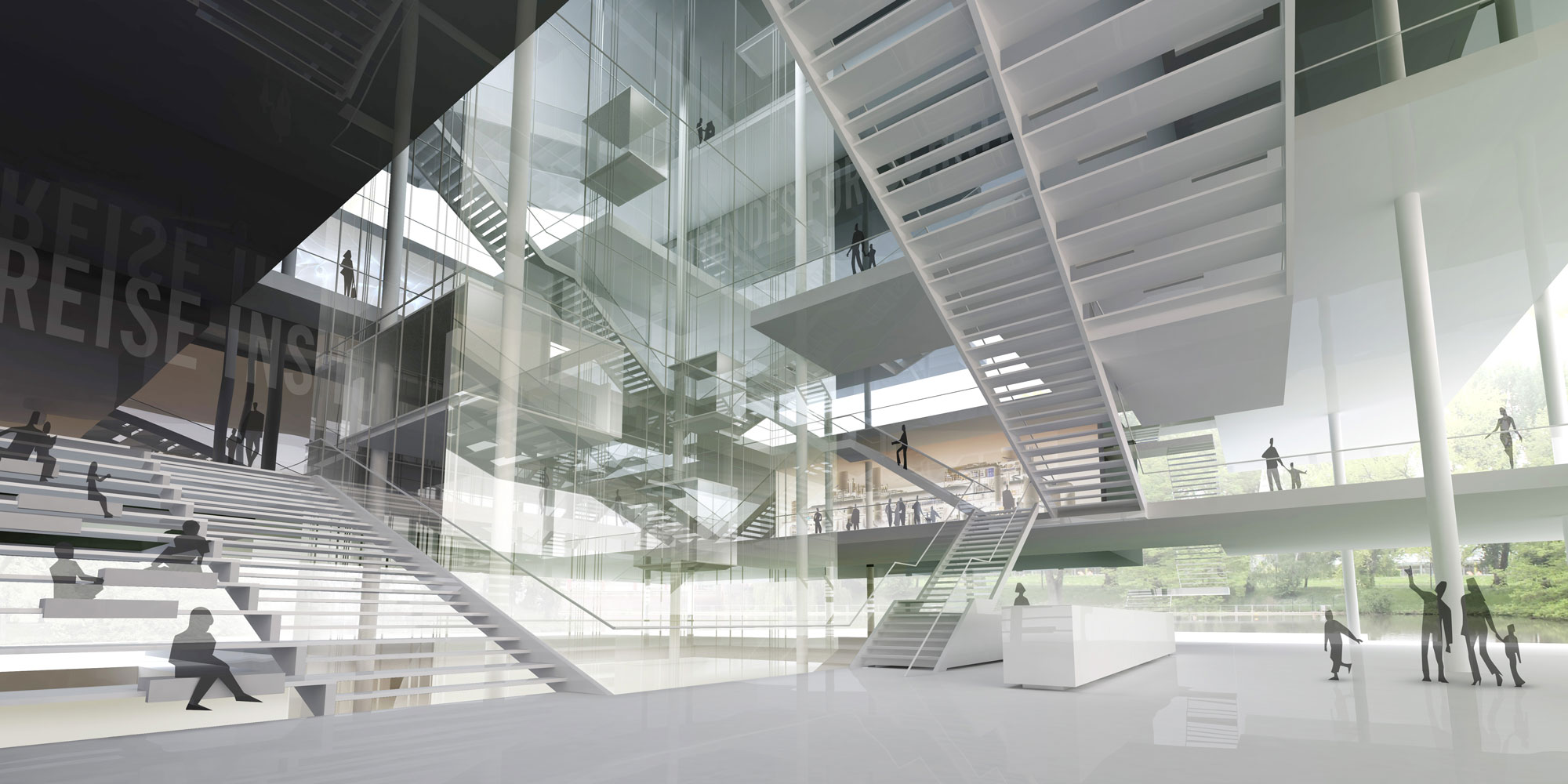 The central urban idea relies on the privileged position of the construction site—an island surrounded by the Wilhelm Channel. Located at the point of intersection between the old town and the newer train station area, the design concept for the Experimenta Zentrum is based upon achieving the optimal transparency and radiance of the structure. The equivalence of all sides of the building and its pavilion-like character help to allow it to act as a link between the old and new towns on the opposite bank, urban references and axes are filtered and expanded in a exciting manner. The configuration of the building includes four construction volumes which each host a separate thematic world: „human“, „nature and environment“, „technology“, and „digital worlds“.