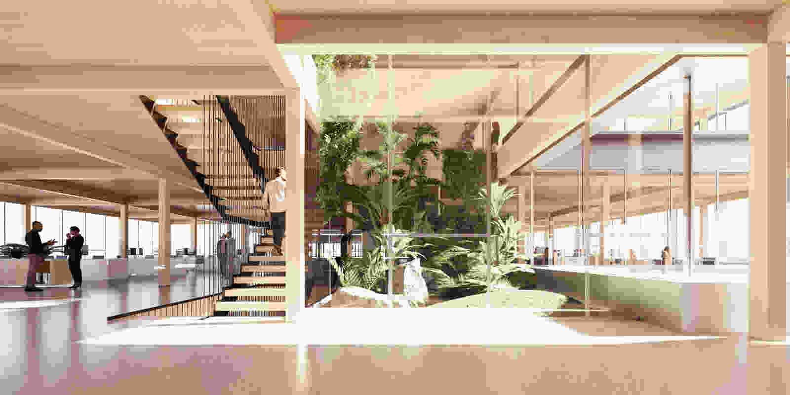 While this ground floor is executed in reinforced concrete in order to create a ‘solid’ base, the office areas above consist of modular ‘realms of possibility’ that combine with green external spaces at every level to create a positive environment for working and communication.